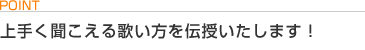 好きなあの曲を上手く歌いたい!、有名歌手みたいな声を出すには?と色々と考えているものの、そのために実際にボイスレッスンを受ける方は少ないのかもしれません。しかし実は、カラオケが上手く聞こえるためには、いくつかのポイントがあるのです。当教室では、 歌うタイミング、マイクの持ち方・使い方、機材の調整(エコー、ボーカルのバランスなど)から始まり、サビとサビ以外の歌い方、どこを見て歌うかなどなど様々なポイントを指導致します。