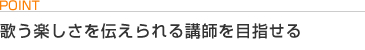 今までの音楽経験を生かして、歌う事の楽しさや喜びを多くの人に伝えたい!そんな想いを抱いている方も多くいらっしゃると思います。しかし、歌を上手く歌える事と、上手く歌えるように指導できる事は違います。正しい知識がないのに、自己流のやり方を教えてもすべての人に通用するわけではありません。当教室では、様々な歌唱法や指導法のレクチャーの仕方を中心に、正しい発生法の理解と体得を習得できるように指導してまいります。